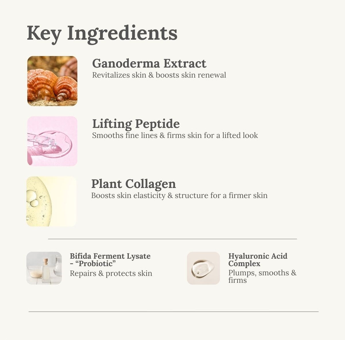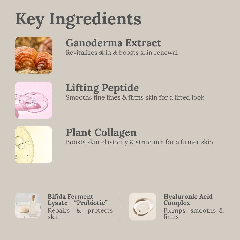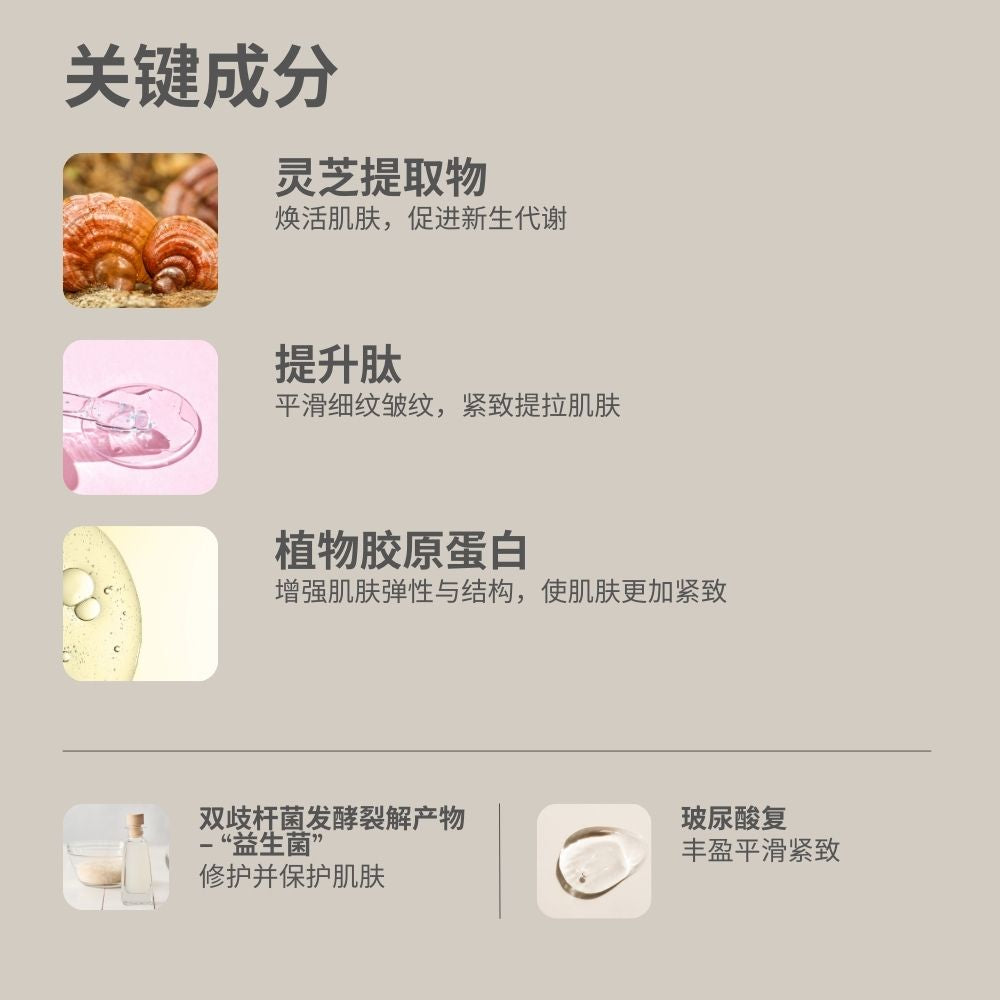 蕴含灵芝萃取、植物胶原与提升六胜肽,深层滋养、紧致轮廓,并提升肌肤弹性,重拾年轻轮廓感与光采。