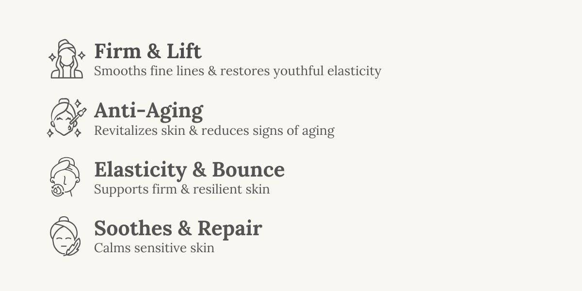 多重分子玻尿酸搭配舒缓植萃,有效修护肌肤、改善干纹与松弛,让肌肤恢复丰盈弹润与健康光泽。