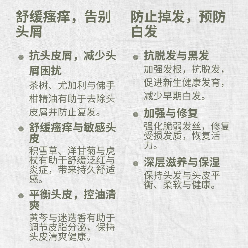 精油组合融合了茶树、尤加利、佛手柑、迷迭香与洋甘菊,可净化头皮、抑制引发头屑的微生物,让头皮清爽健康。