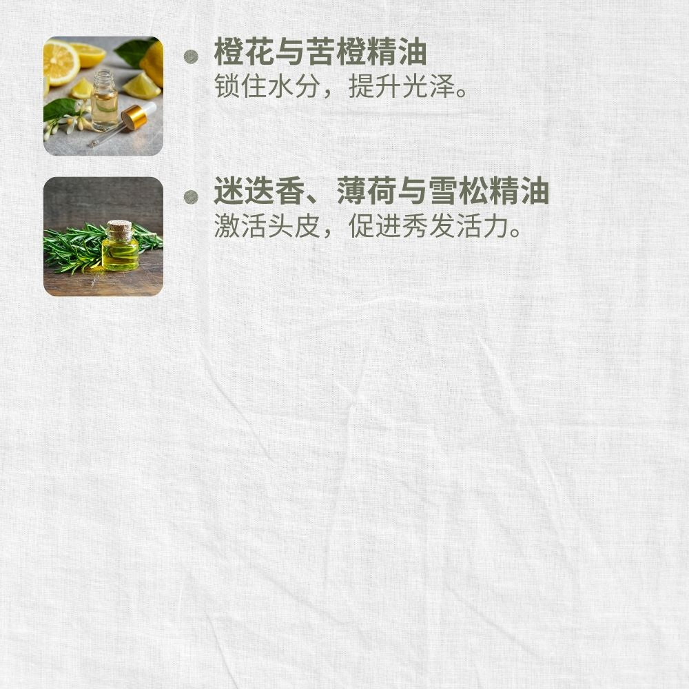 精选橙花、苦橙、迷迭香、广藿香、薄荷与雪松精油,激活头皮循环,增强发丝光泽,令秀发柔顺有弹性。