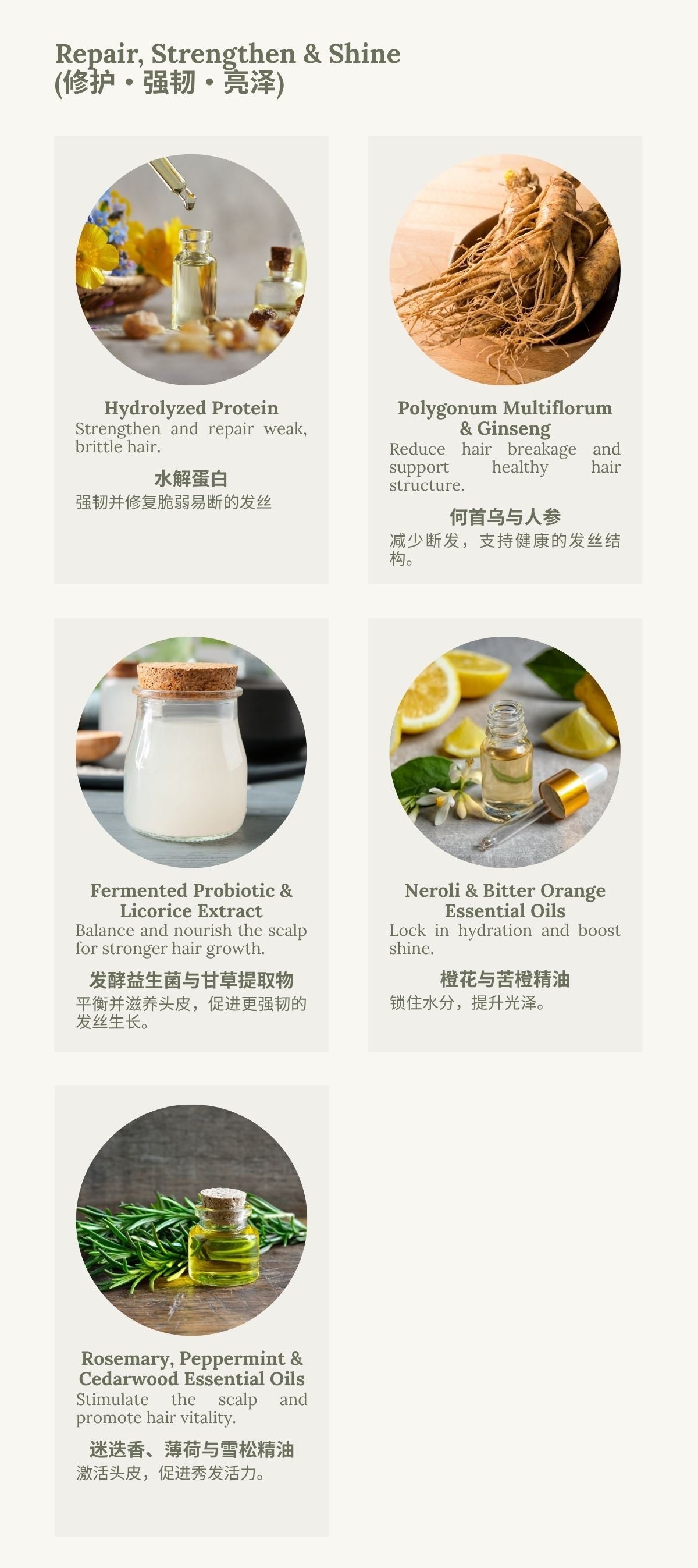 这款修复喷雾结合水解蛋白、何首乌及人参萃取,有效修复脆弱发丝、减少断裂并支持更强韧、更健康的生长。