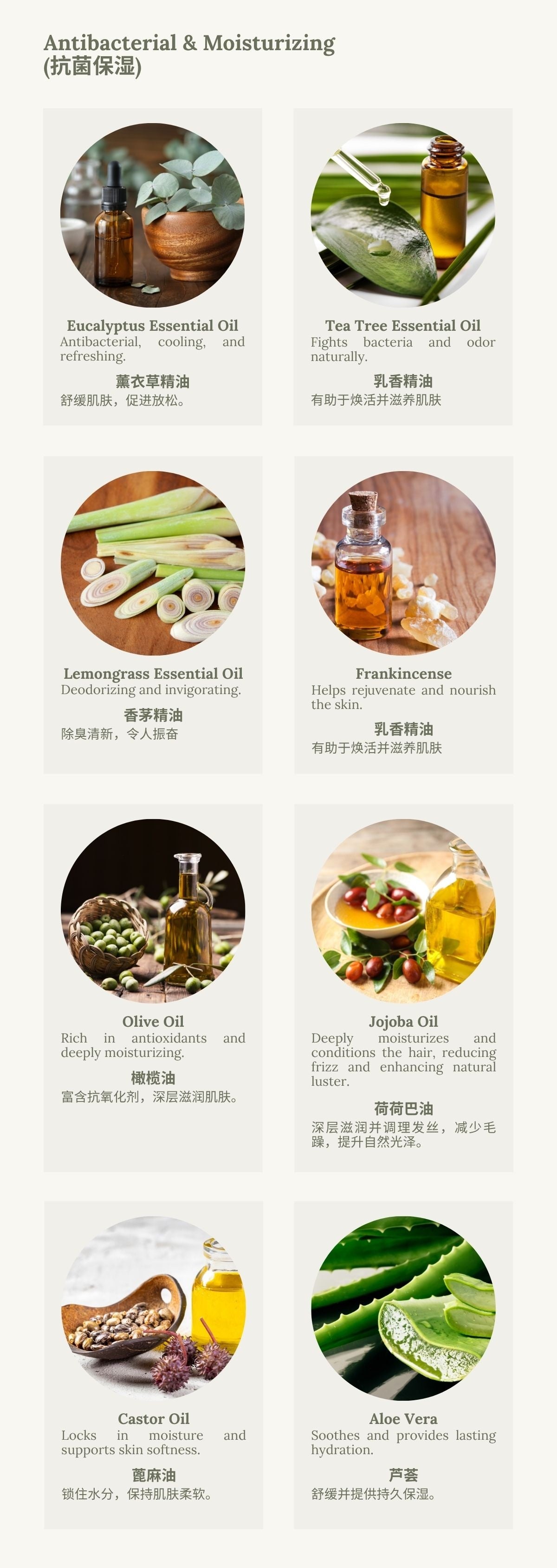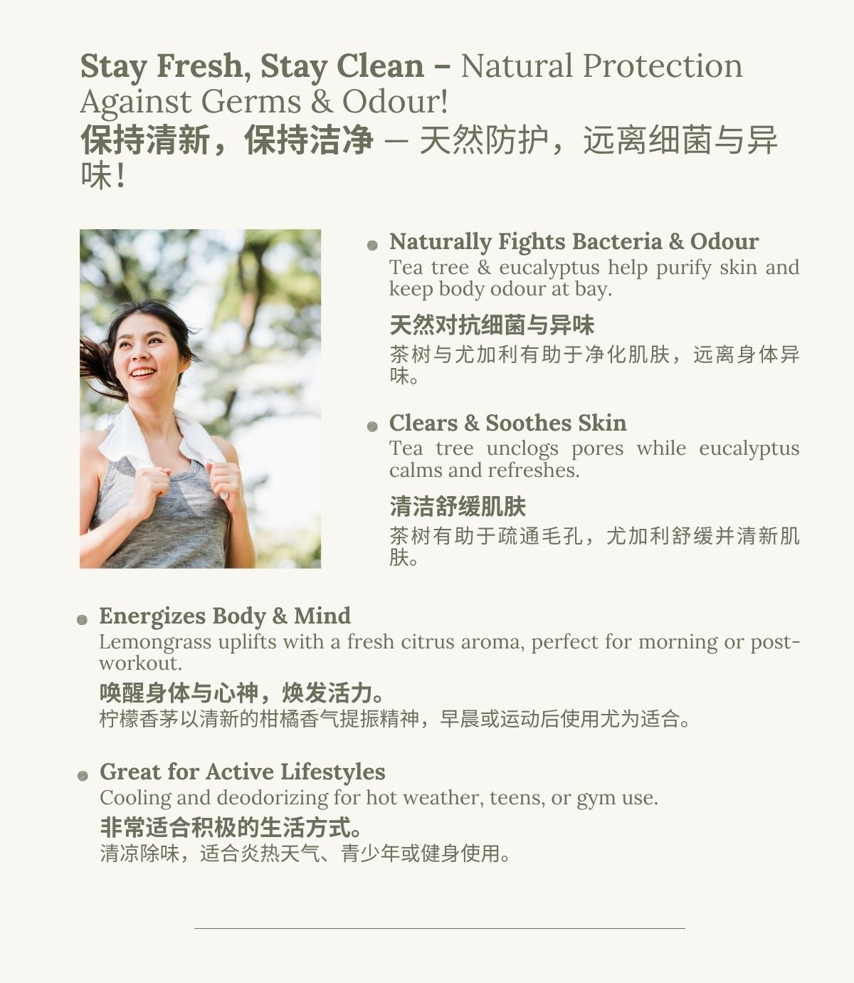 天然除味与净化,帮助减少异味、清理毛孔、平衡肌肤健康——带来清新洁净的一次洗浴体验。