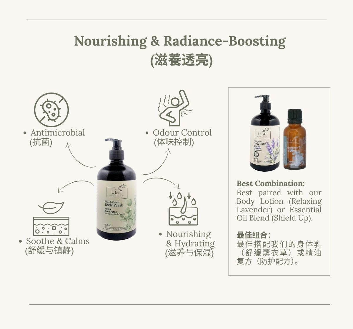L&P Organic & Natural Mild & Gentle Body Wash (Active Eucalyptus) delivers purifying, antibacterial care that cools, cleanses & combats body odour-naturally.