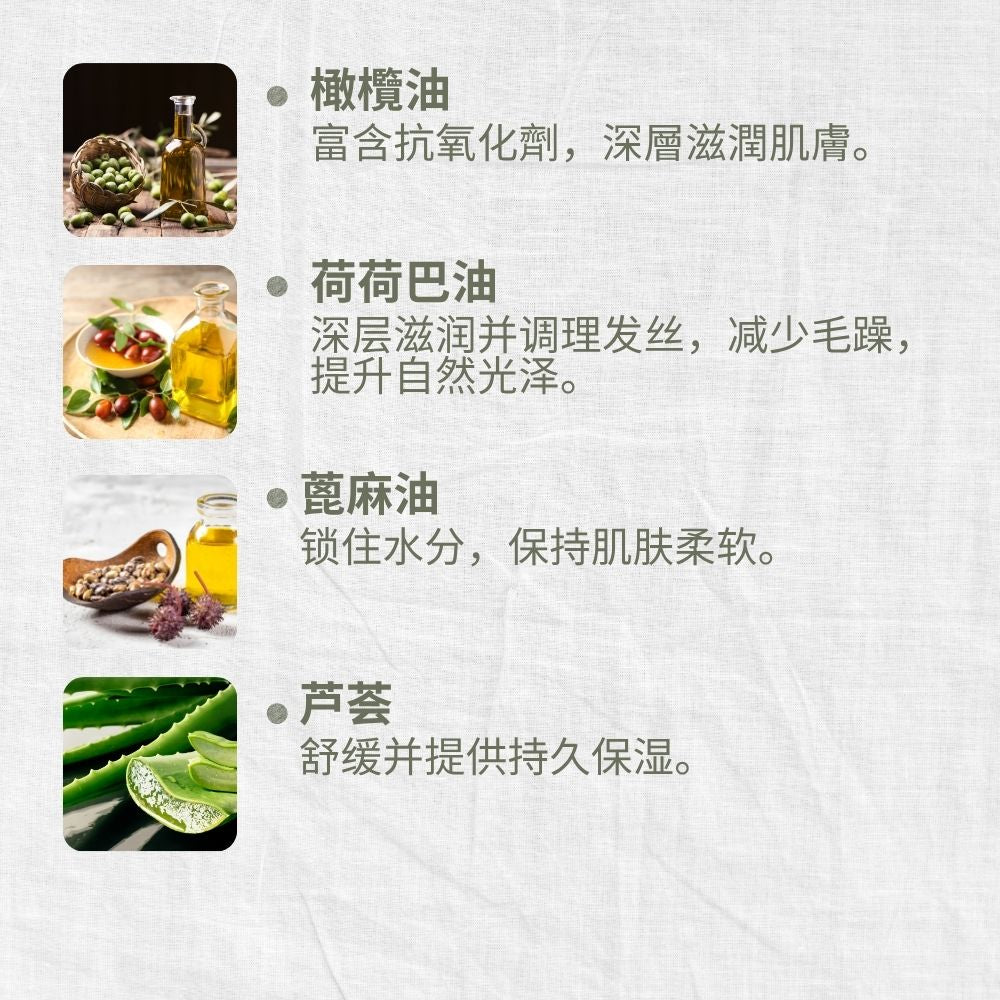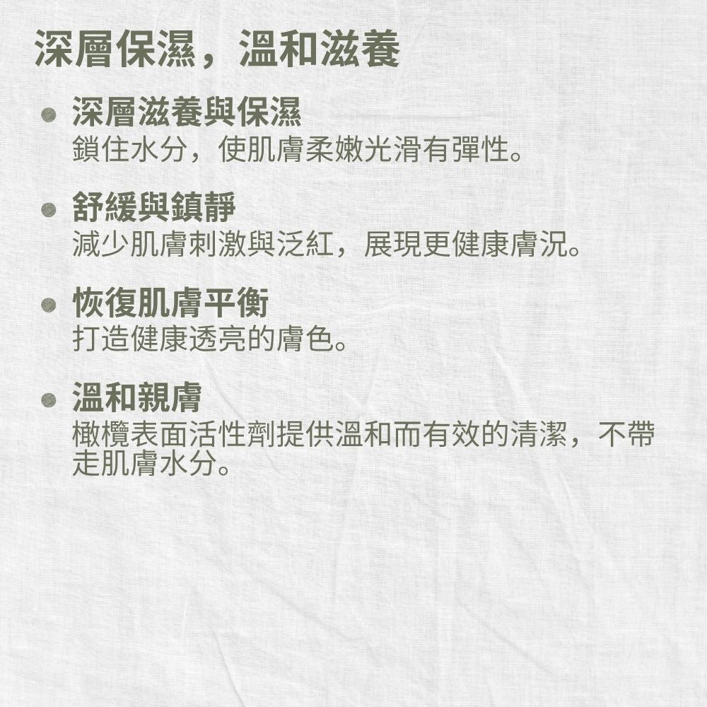 这款呵护肌肤的配方融合橄榄油、荷荷巴油与蓖麻油,温和洁净的同时不带走肌肤水分。搭配芦荟萃取及天然柑橘精油组合(甜橙、佛手柑、橙花与乳香精油),洗净疲惫,滋养并舒缓娇嫩肌肤,同时唤醒好心情。