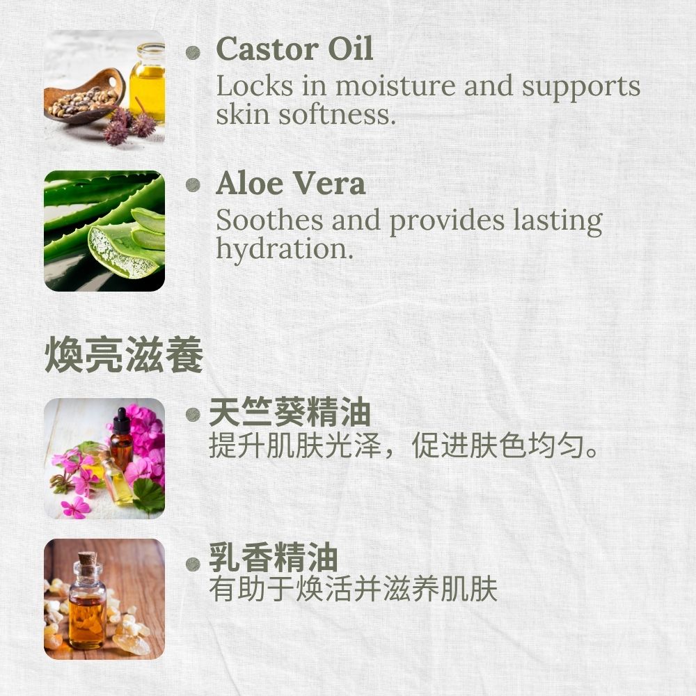 注入天竺葵与乳香精油,平衡肌肤,舒缓身心,让您在每一次沐浴中焕发清新与元气——源自大自然的温柔力量。