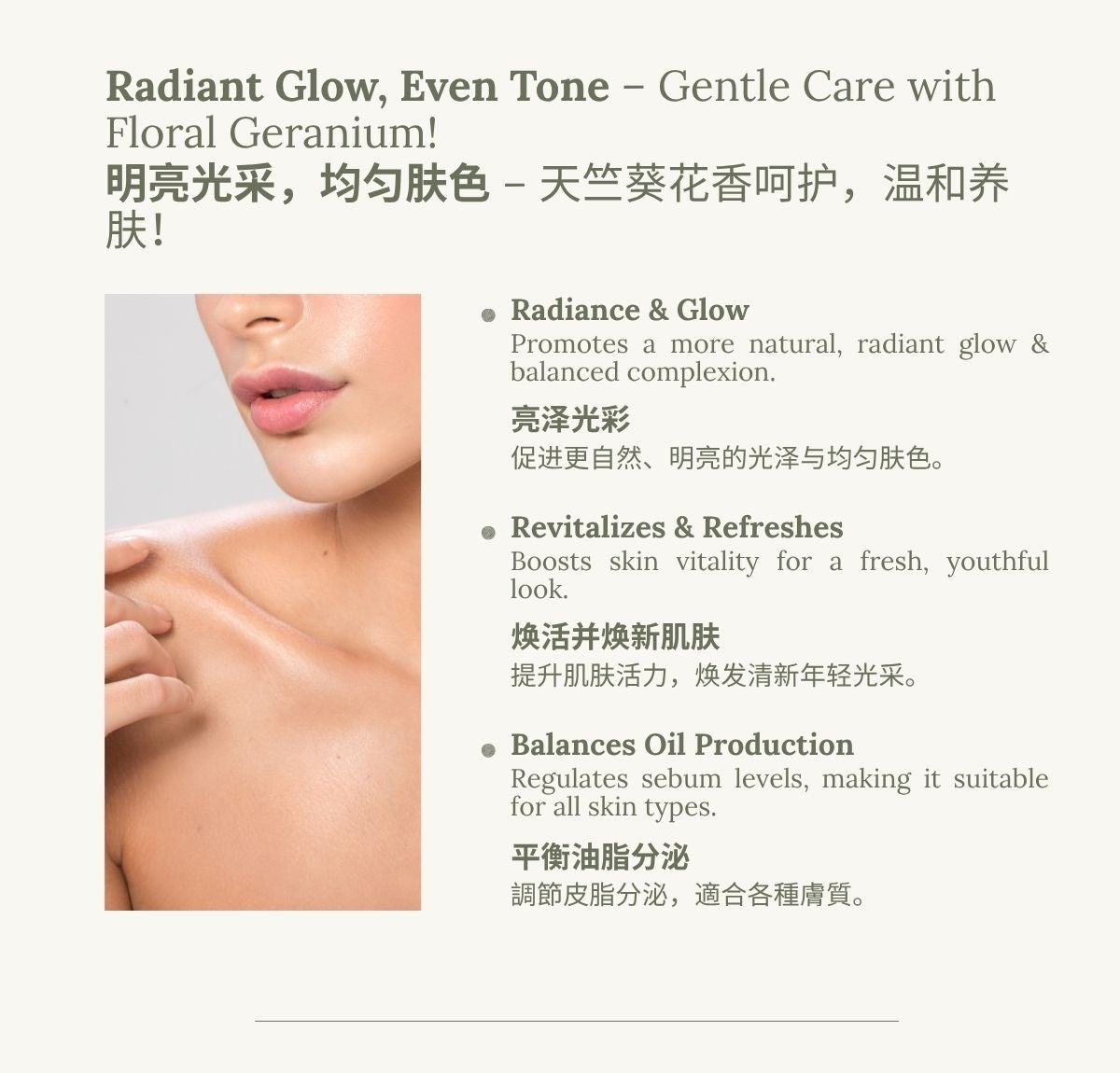 Infused with geranium & frankincense essential oils, it calms the mind, balances the skin & leaves you feeling refreshed & restored - naturally.