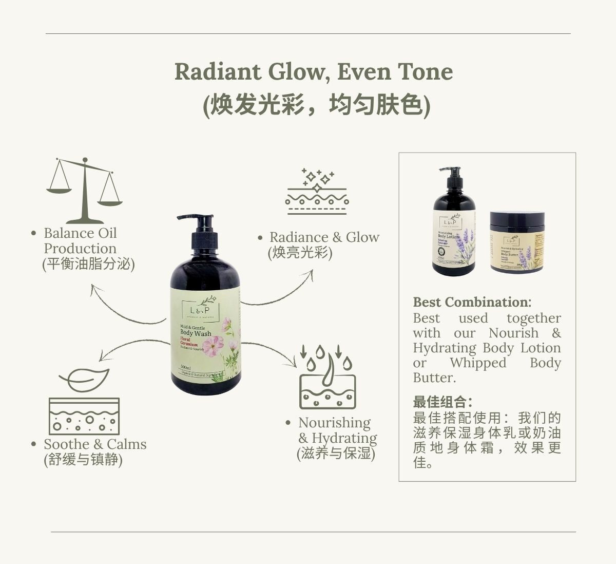 L&P Organic & Natural Mild & Gentle Body Wash (Floral Geranium) offers a nourishing cleanse that pampers sensitive skin while uplifting the senses with a soft floral aroma.