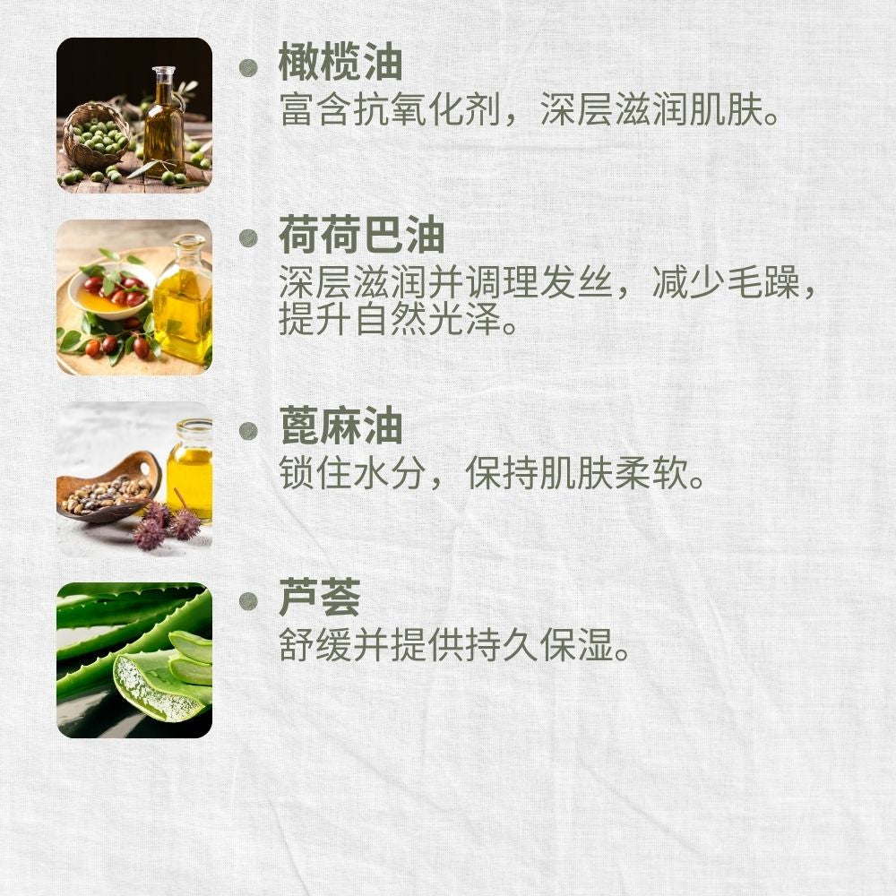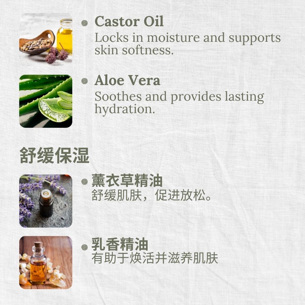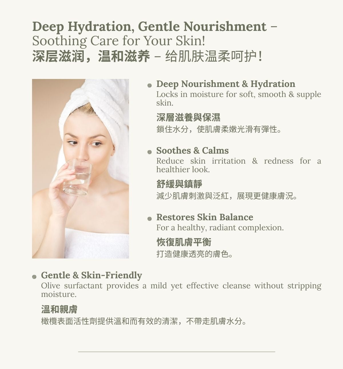 这款超温和配方融合橄榄油、荷荷巴油与蓖麻油,洁净肌肤的同时深层滋养,不带走肌肤天然水分。特别添加芦荟舒缓成分,有效减轻肌肤不适,并以薰衣草和乳香精油带来宁静香氛,让每一次沐浴都成为疗愈与焕新的时刻。