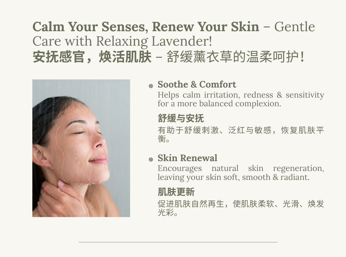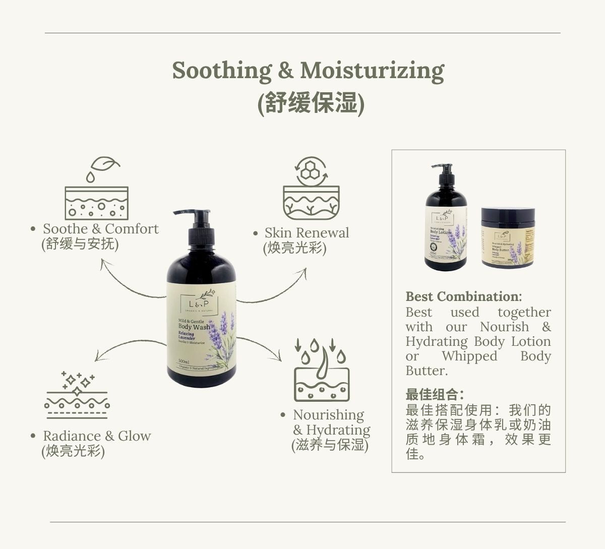 为干燥或敏感肌烦恼吗? L&P 有机天然温和沐浴露(舒缓薰衣草)**温和洁净,舒缓肌肤与身心,是您每日放松身心的理想选择。