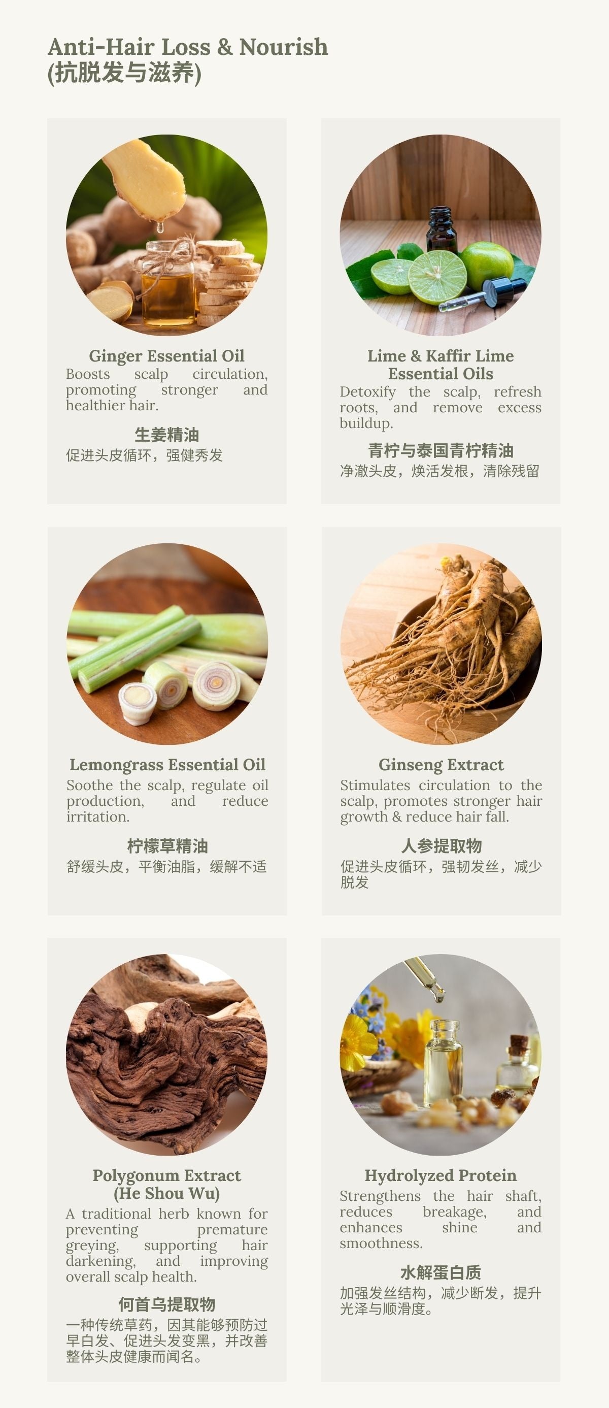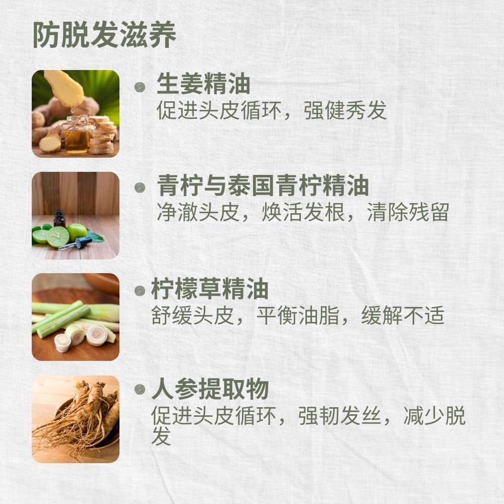 人参提取物和何首乌提取物帮助促进头皮血液循环,激发健康生长。富含生姜、青柠、卡菲尔酸橙和香茅等精油的清新配方,唤醒头皮, 同时搭配雪松、迷迭香与檀香,平衡油脂分泌,带来持久蓬松与光泽。