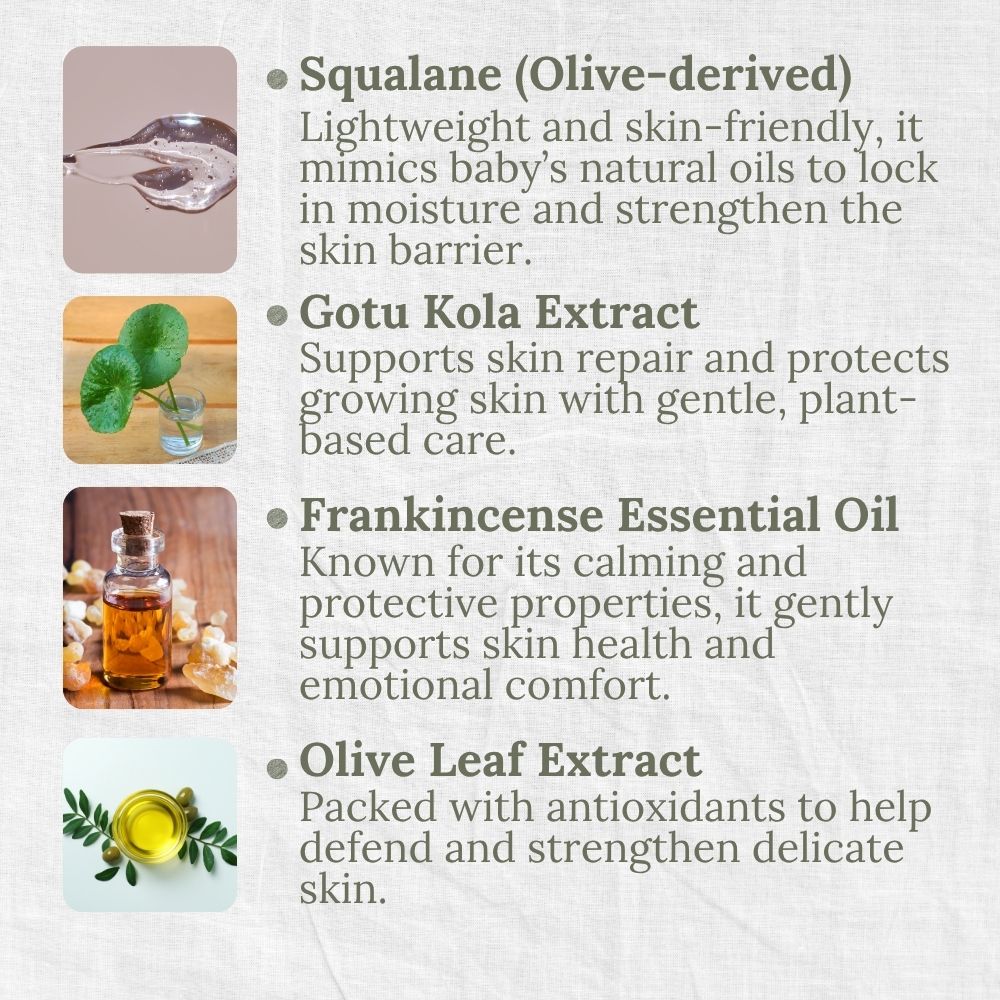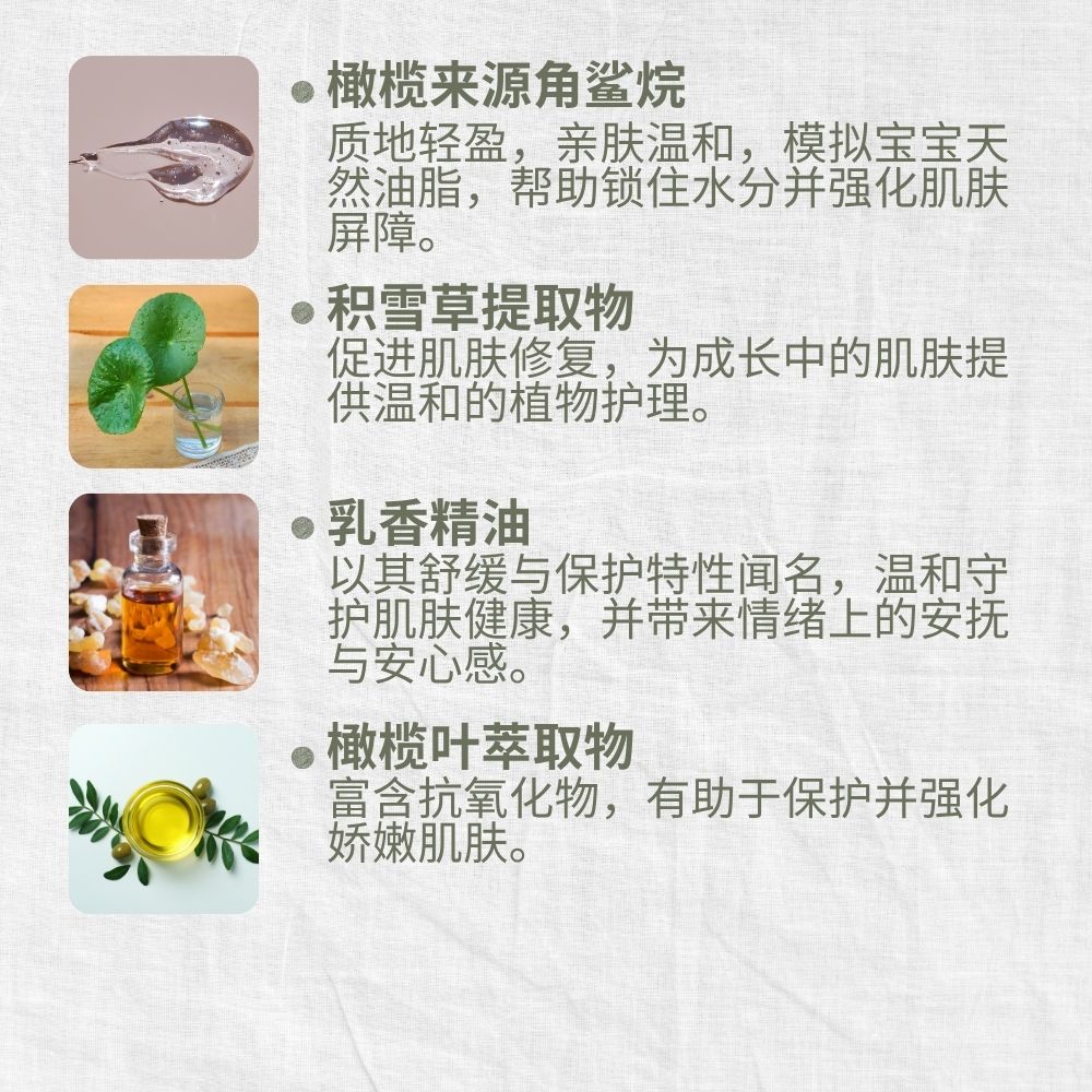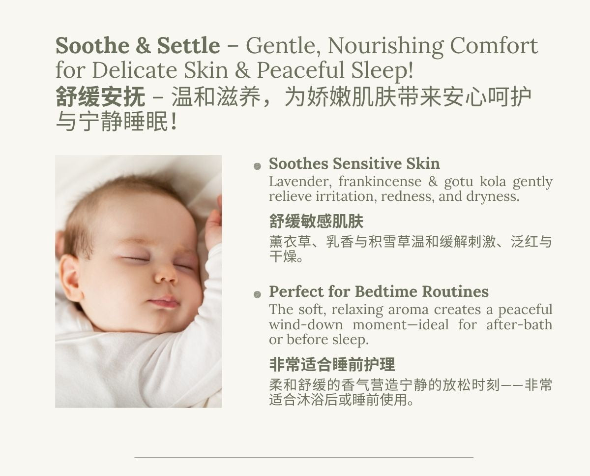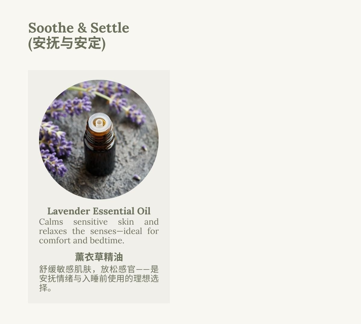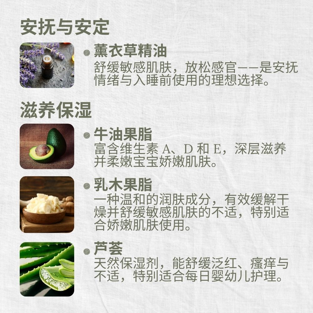 特别注入薰衣草与乳香精油,带来放松与安抚的香气,为宝宝打造沐浴后或睡前的宁静时光。