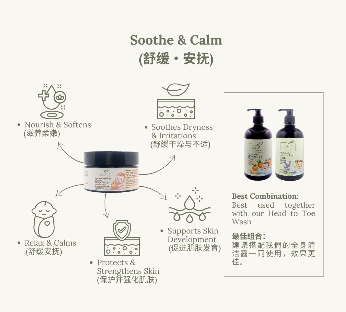 L&P 有机舒缓滋养身体乳霜(宁神薰衣草)专为呵护婴幼儿娇嫩肌肤而设计,温和滋润、舒缓不适,为宝宝提供全天候的天然保护。