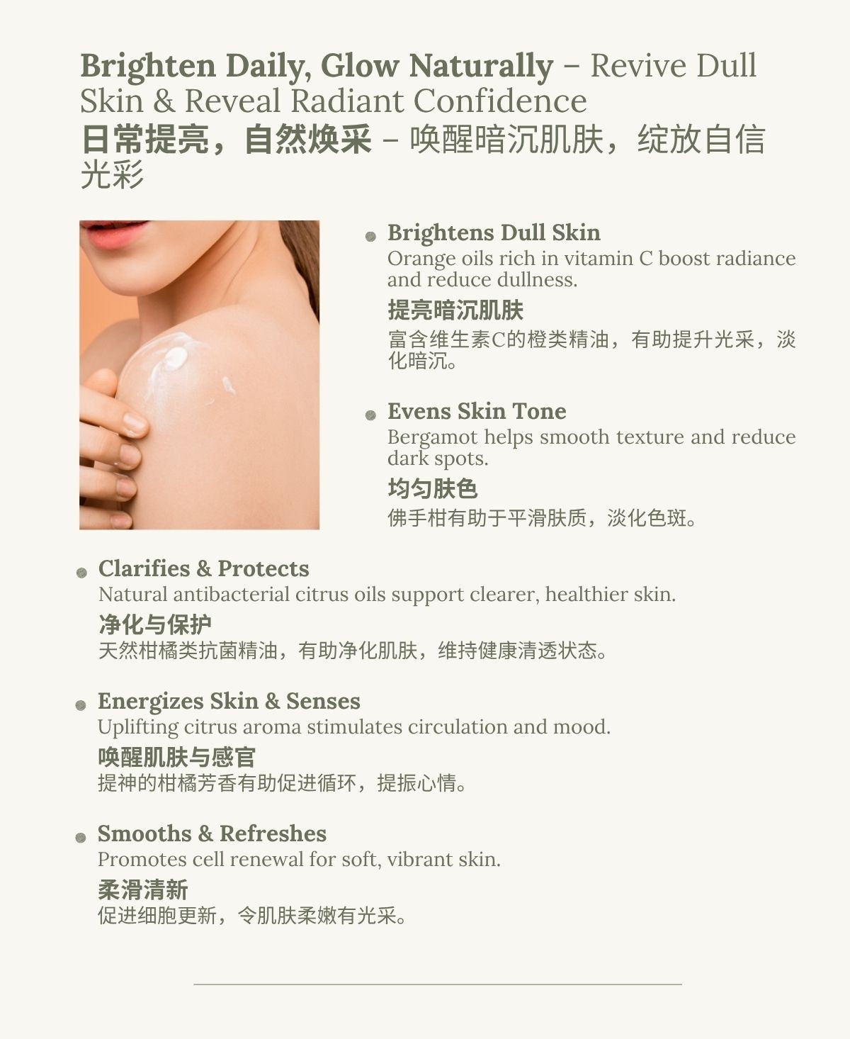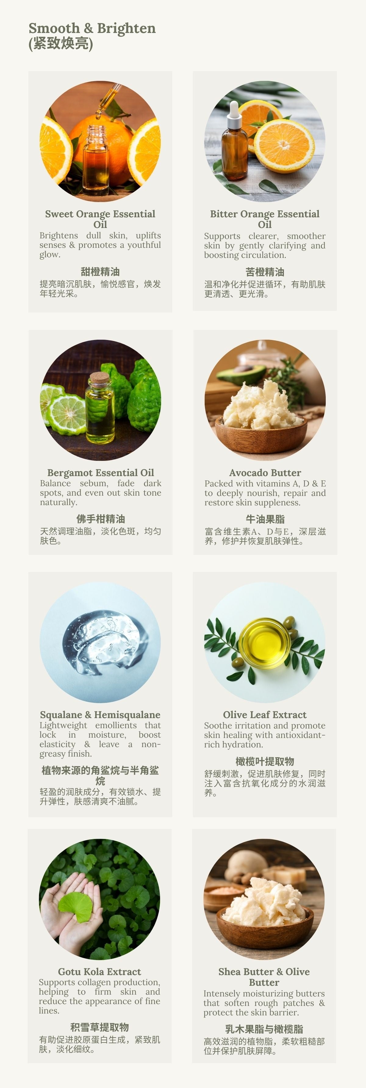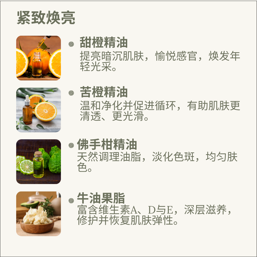 这款奢润柔滑的乳霜,蕴含有机牛油果脂、乳木果脂与橄榄脂,深入滋润干燥肌肤;搭配角鲨烷与半角鲨烷,有效改善肌肤弹性与纹理。融合提亮肌肤的柑橘类精油(甜橙、佛手柑与苦橙)以及焕活乳香精油,唤醒暗沉肤色,令肌肤自然均匀、焕发亮采。