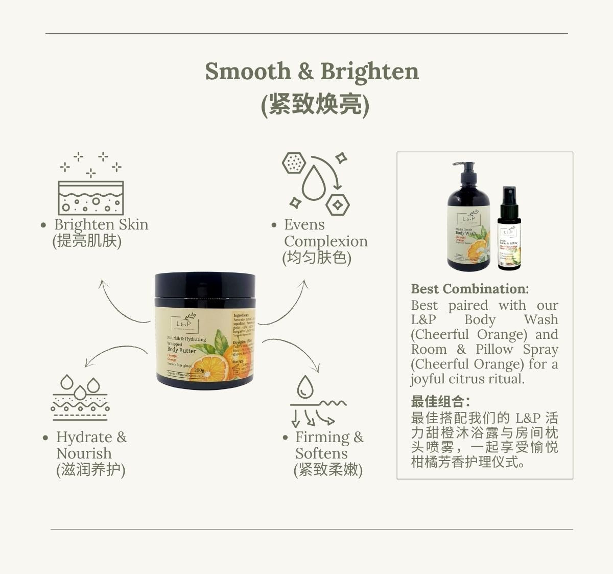 L&P 有机天然滋养保湿空气感身体乳霜(活力甜橙)是你每日柑橘焕肤能量来源——深层滋养、提亮、紧致肌肤,自然焕发光采。