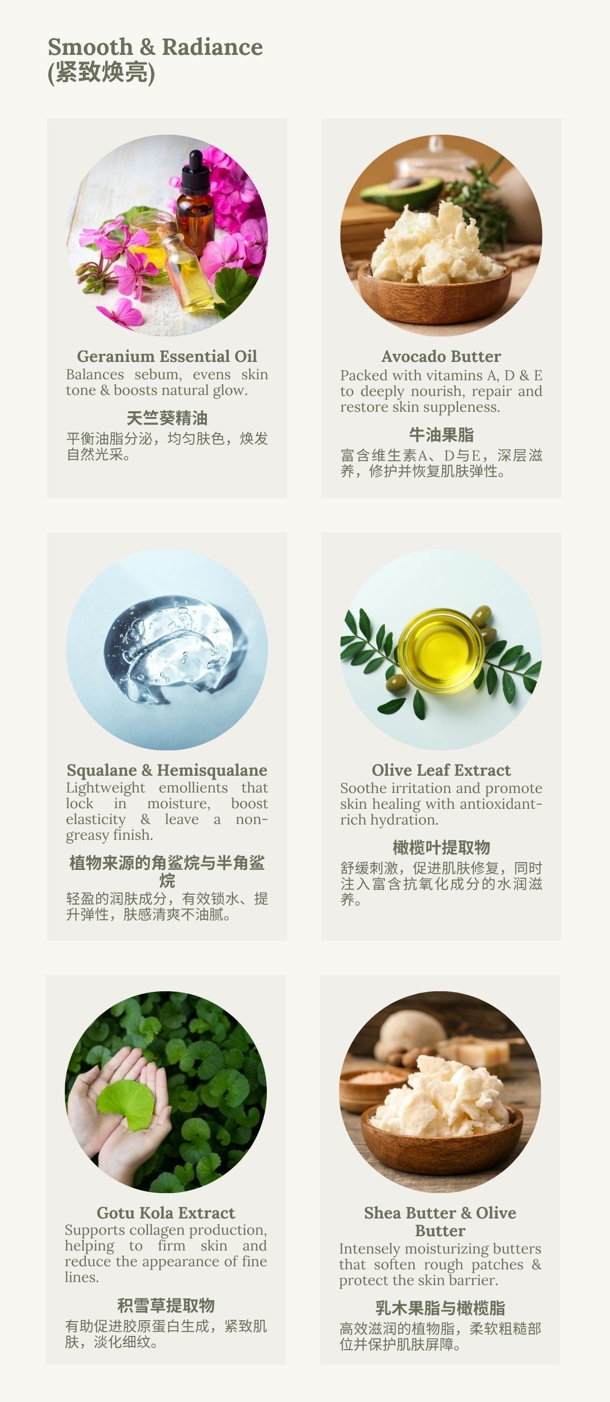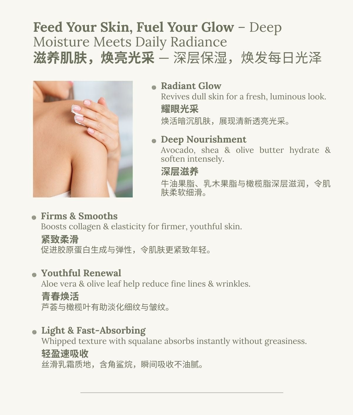这款丰润配方蕴含有机牛油果脂、乳木果脂与橄榄脂,深层滋润干燥肌肤,使肌肤柔软细滑。添加角鲨烷、芦荟与积雪草,有效促进胶原蛋白生成、提升肌肤弹性,焕发自然光采与年轻光泽。有机天竺葵与乳香精油调理肌肤,同时唤醒感官,为你带来自内而外的花香美肌体验。
