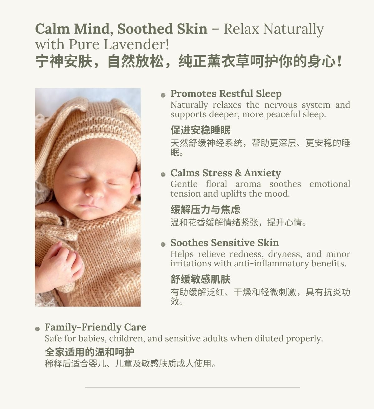 ✔ 全家适用 – 稀释后适合婴儿、儿童及敏感性肤质使用。