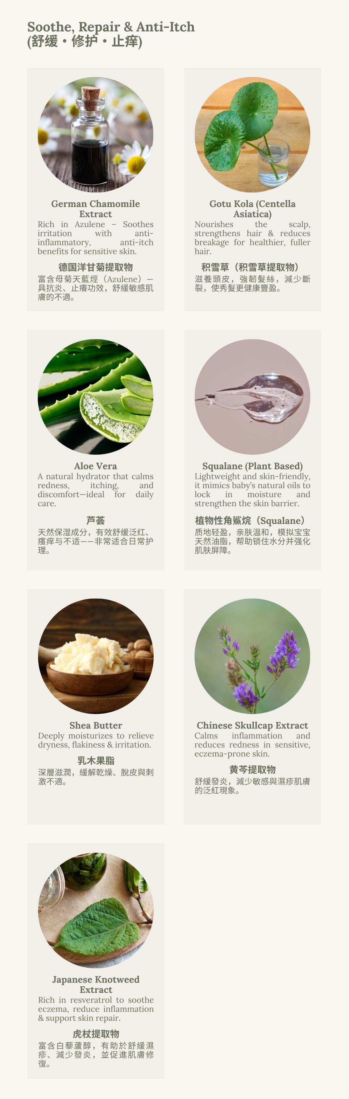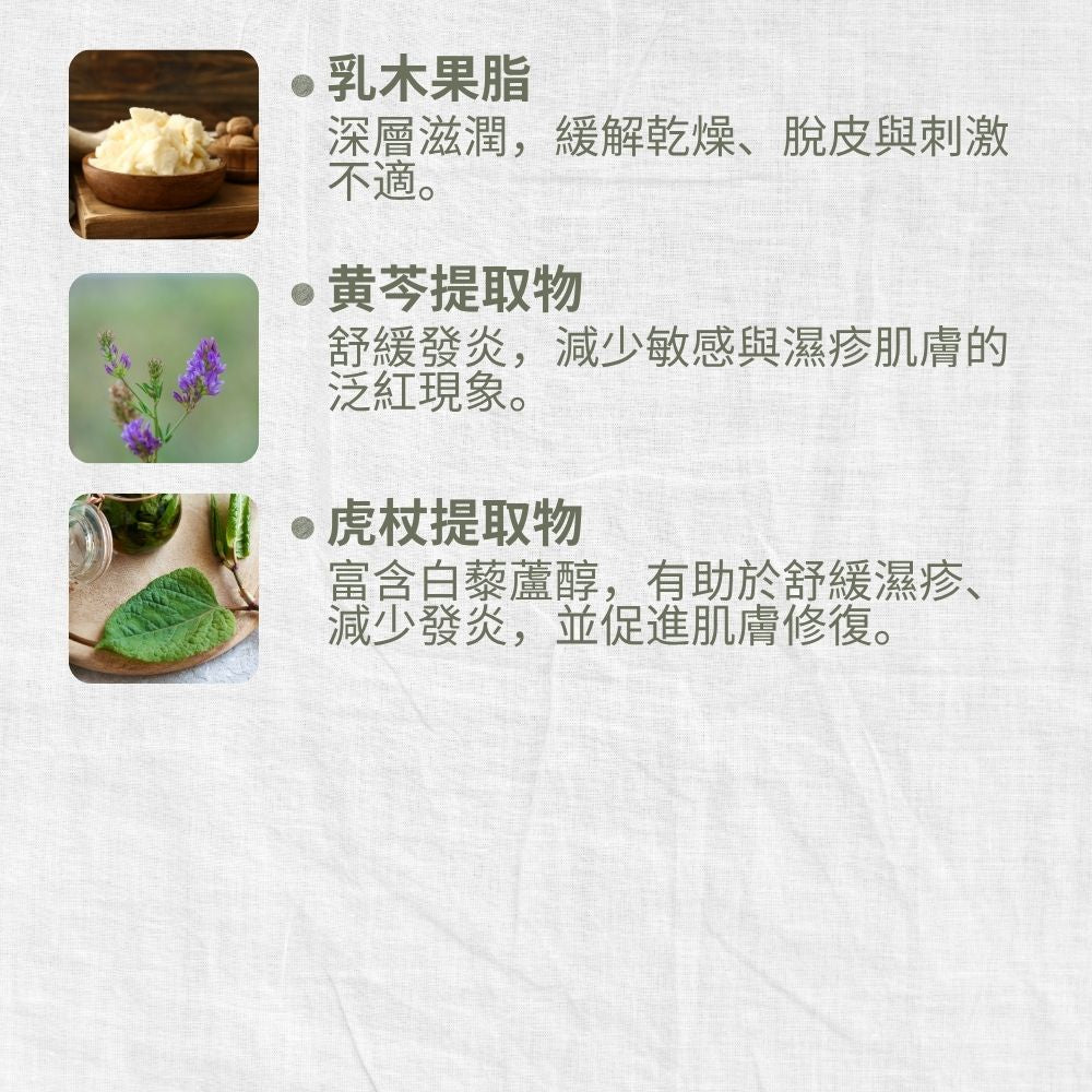 植物修复萃取(积雪草、虎杖、黄芩、甘草和洋甘菊)能帮助缓解红肿发炎、加速肌肤自然修复。