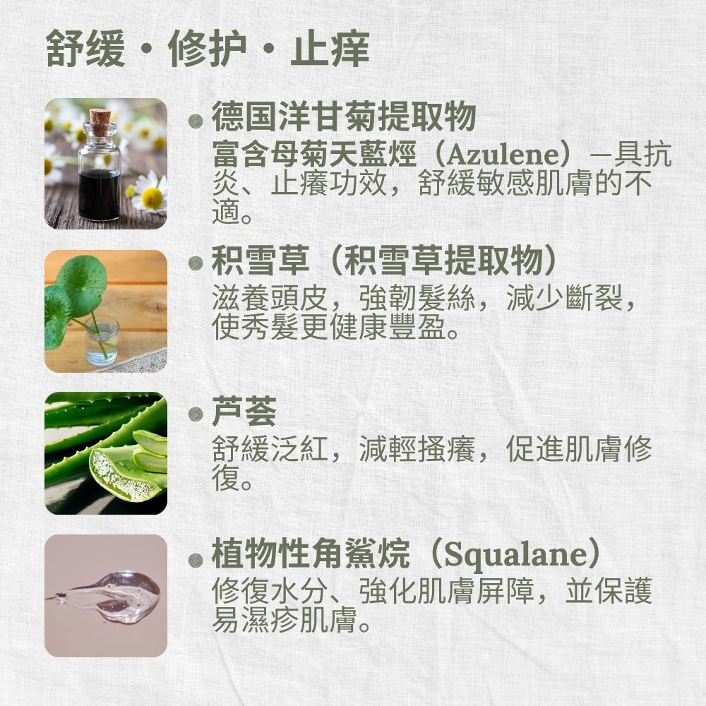 不含类固醇、合成香精及刺激性化学物,采用认证有机 & COSMOS 天然成分配方,宠物爸妈安心首选,毛孩喜爱信赖。