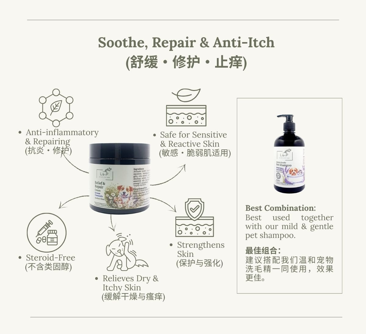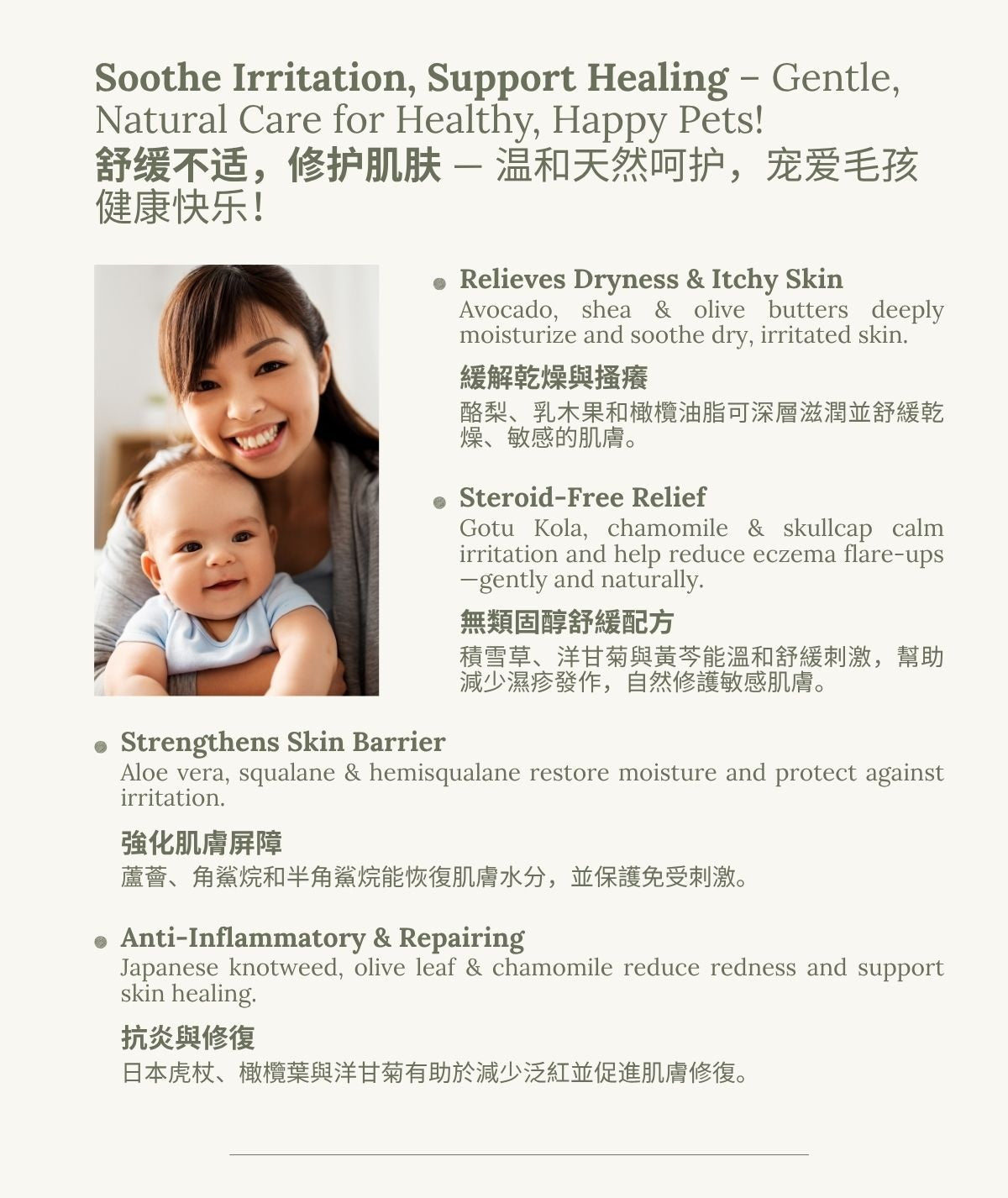 温和而有效,深层滋润、舒缓并保护爱宠肌肤。适合局部热斑、干裂、轻微伤口或爪部护理。